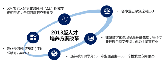 修订人才培养方案(2013版),将应修读课程总学分调整为130分,其中通识教育课55学分,专业主干课50学分,个性发展方向25学分,以便于学生利用信息技术手段更多地开展自主性学习、探究性学习和个性化学习。