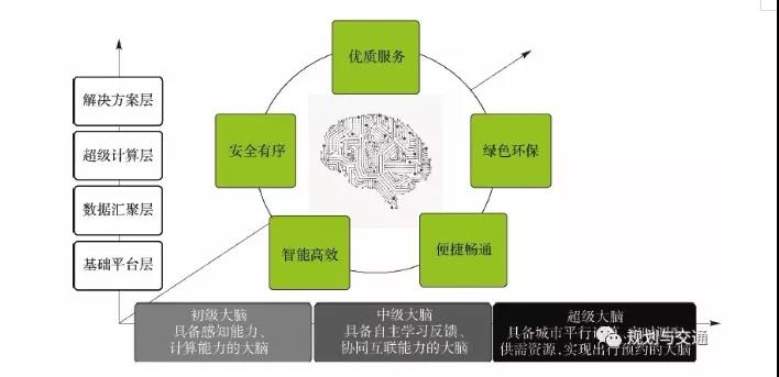 ①构建智慧自省、决策与实时响应能力的“大脑”,实现对交通运行问题和网络优化潜力的主动判断,自助反馈,实时调整与调配公共资源;②构建基于“大脑”计算结果的中长期治理决策方案,实现对城市交通发展方向乃至城市的发展方向的把控。基于此构建一体化、个性化、按需分配的出行服务体系,实现零拥堵、零延误、零等待的交通出行服务最佳体验。