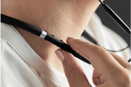 Jabra Evolve 75e蓝牙耳机外观看起来简洁大气,颈带式造型设计符合人体工学的佩戴需求,且商务气息十足。两侧耳塞配置有磁性连接,能够在不佩戴时贴合在一起,方便收纳,不用担心像其他耳机那样丢失。重量上来看,50g的重量拥有名副其实的轻薄感,整天挂在脖颈上也几乎毫无感觉。环颈的材质采用类肤质感的涂层,佩戴时非常舒适,不会产生出汗粘黏的情况。耳机提供了三套耳胶和耳翼,不同耳部构造都适合佩戴,就算要开一个长长的电话会议也不用害怕耳朵酸疼了。