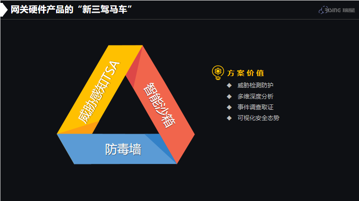 瑞星基于以上问题,形成了以网络防护为主,协同终端与云的新网络安全解决方案。这就囊括了瑞星网关的三大“硬核”产品:瑞星防毒墙(包括专业网络防毒的导线式防毒墙以及定位于多功能安全网关的下一代防毒墙)、瑞星威胁感知系统TSA,以及最新推出的产品瑞星智能沙箱分析系统。