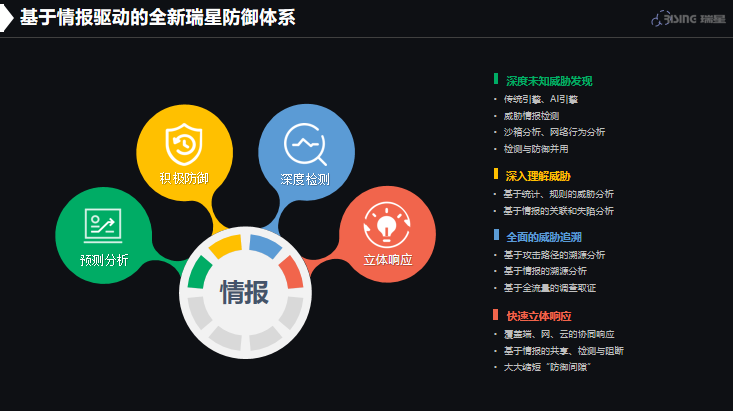 瑞星基于以上三大核心网关硬件产品,协同瑞星其它企业级产品,形成了全新的以情报驱动的自适应防御体系,该体系通过预测分析、积极防御、深度检测和立体响应四个维度形成安全闭环。