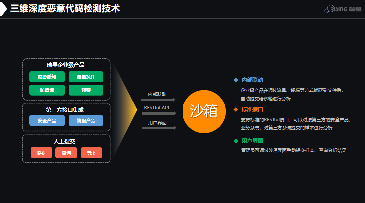 瑞星此次发布会推出的全新硬件产品瑞星智能沙箱分析系统是瑞星公司最新开发的一款文件分析系统,通过虚拟机执行样本,并且监控样本执行过程中的行为,获得其行为和风险。它对于发现未知恶意代码具备非常好的效果,同时可以通过分析报告的形式帮助用户了解样本中的风险行为和利用的恶意IP、域名等资源。