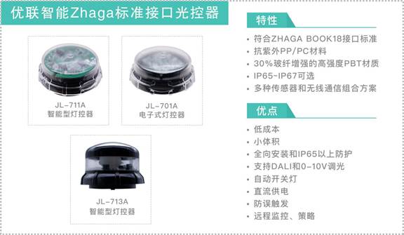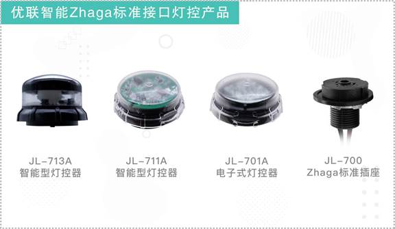 据悉,2019年优联智能规划了十几款Zhaga标准接口的灯控器研发,目前三款开发完成并面世的灯控器型号分别为JL-711A,JL-713A,JL-701A,适用于户外道路照明,包含园区、厂区、公园、家庭庭院等各类场景。