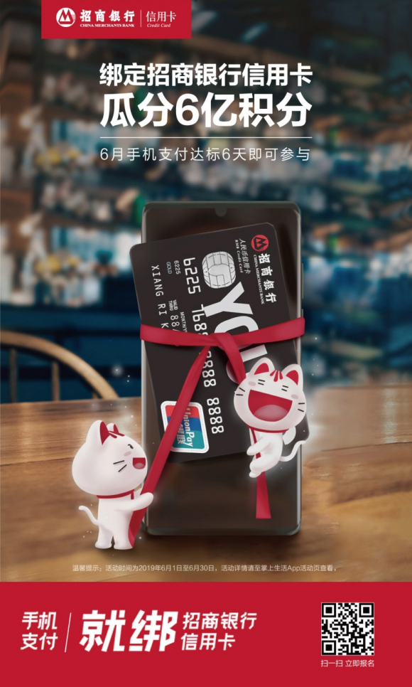作为个人重要信贷支付工具,信用卡也在加速转型,为用户打造新时代“手机支付”体验。招商银行信用卡宣布在6月开启“6亿积分大赏”活动,凡按规则完成手机支付任务,即可参与瓜分6亿积分,为“手机支付”进程再添一把猛火。