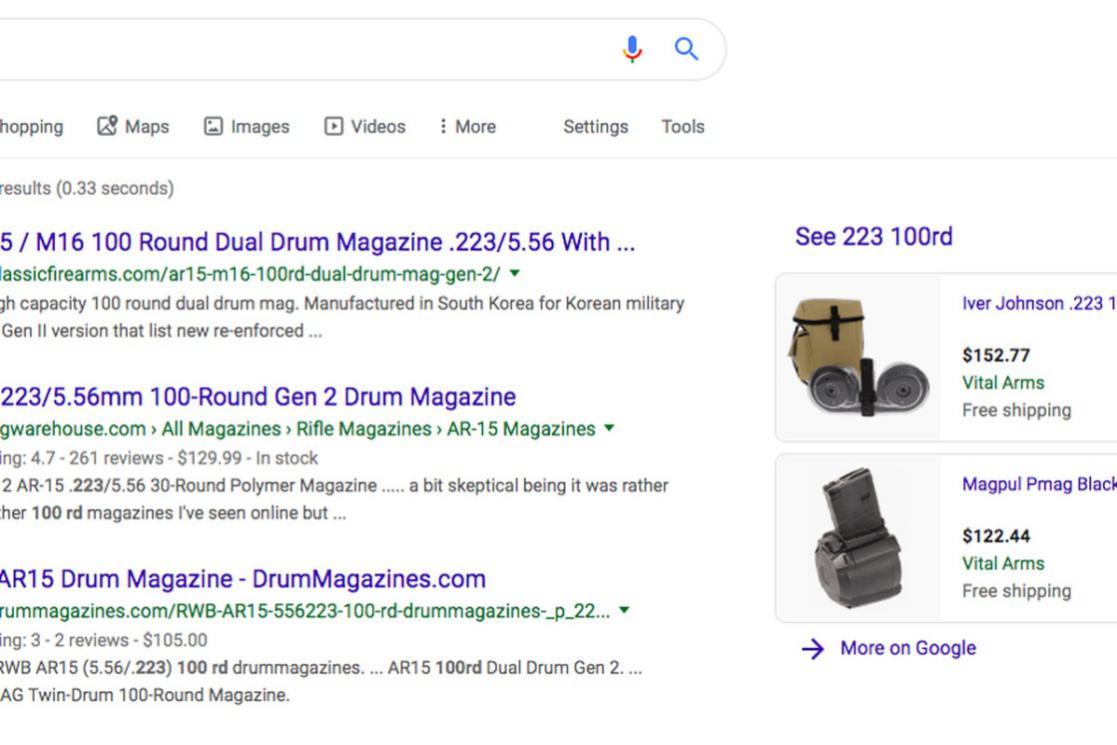 这显然违反了谷歌在2012年发布的禁止枪支广告的禁令。据The Verge报道,在谷歌搜索“.223 100rd”(圆形的简称),便可在页面右侧显示广告内容,点进去便可直接购买该产品。
