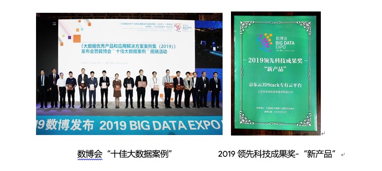 工信部自2016年起,每年向全国范围征集优秀大数据应用案例。2019年工信部在全国范围内共征集到1000个左右的大数据产品优秀案例,其中评选出了94家优秀案例编撰成册,并从中评选出数博会“十佳大数据案例”进行公布。这也是工信部体系内在大数据领域的最高级别的评优。同时,领先科技成果奖评选是数博会的重磅环节之一,京东云JDStack专有云平台也荣获2019领先科技成果奖-“新产品”奖项,这也是该产品再次获得行业认可。