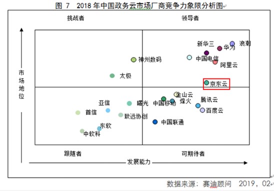 2019年6月,赛迪顾问发布《2018-2019年中国政务云市场研究年度报告》,作为中国电子信息产业发展研究院下属机构,赛迪顾问长期追踪研究中国工业和信息化领域发展现状与趋势,其对于市场趋势的判断和竞争格局的分析具备极高的参考价值。该报告中,京东云位列中国政务云市场厂商竞争格局图的第一象限。报告认为,京东云近两年紧抓“智慧城市”建设机遇,发展迅速并快速地整合超敏捷架构、区块链等新一代关键技术,率先赋能政府和城市, 以“智慧城市”为突破口,切入政务云市场,在城市落地“五个一”模型。可以预见,京东云基于“五个一”战略,将实现政务云的快速增长。(注:此报告研究的是2018年的政务云市场,“智慧城市”是赛迪对该领域的统一说法。)