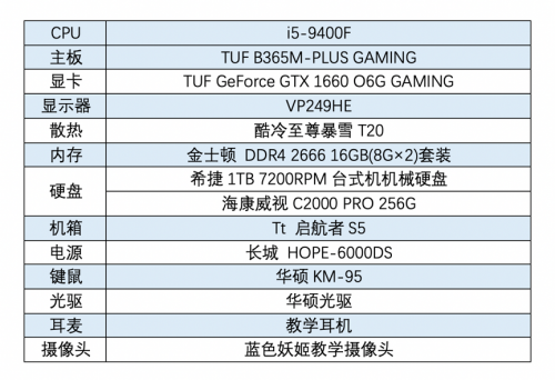 首先是一套Intel主机平台,其采用Intel酷睿i5-9400F处理器,原生6核心6线程,睿频可至4.1GHz,精简核显后颇具性价比,可谓是当下最火爆的中端处理器。而主板则是华硕TUF B365M-PLUS GAMING主板,其拥有更强的供电和散热设计,可尽释这款处理器的潜在效能。且支持Win7、Win10系统,可满足更多用户的需求。再搭配华硕GTX 1660显卡、华硕VP249HE显示器、16GB内存和专业教学摄像头及耳麦等,可满足绝大部分的教学软件运行要求,长效稳定流畅运行无压力!
