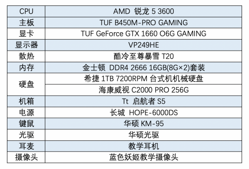 这里还为大家推荐一套AMD平台主机,选用时下主流的AMD锐龙5 3600,该CPU采用6核心12线程设计,可睿频至4.2GHz,多线程技术带来强大的性能表现。主板则是号称“B450M板皇”的华硕TUF B450M-PRO GAMING主板,10相数字供电和覆盖式散热盔甲,完美支持最新的第三代AMD锐龙处理器,并是电脑报年度爆款产品和快科技最具性价比奖获得者。再配合与上套一致的其他配件:华硕GTX 1660显卡、华硕VP249HE显示器、16GB内存和专业教学摄像头及耳麦等,提供更优异的学习体验!