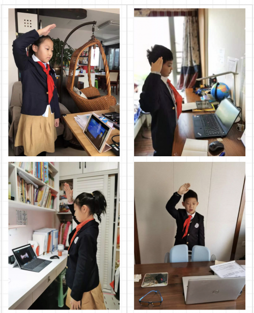 同学们身穿礼服,系着鲜红的红领巾,抬头挺胸敬礼,伴随着高亢激昂的《义勇军进行曲》,升旗仪式正式拉开帷幕。隔着屏幕,全体师生在网络的各自一端,同时将手机、电脑、电视、平板等设备屏幕调为同一画面,共同肃立、注目,五星红旗在全体师生心中冉冉升起,共同迎接新学期的到来。