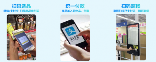 消费者进入店内,只需通过支付宝、微信扫描商品上的二维码,即可加入购物车统一付款。生鲜、水果等商品,也可以由消费者进行自助称重结算。结账后,支付宝或微信平台会发送相应的已支付码,扫描后即可快速离店。