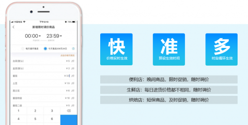 针对需要调价的商品,客如云针对性的研发了自动调价功能,只需要登录掌上客如云APP,即可设置商品需要调价的时间段,设定完成后,系统将会自动完成价格修改,即时生效,实体店电子价签、外卖及电商平台、小程序上的价格也将同步完成修改。
