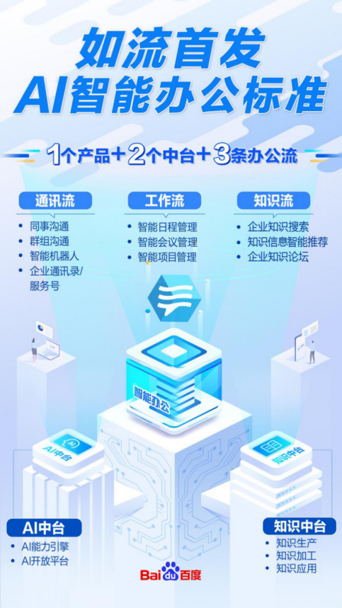 在此背景下,百度作为全球领先的人工智能平台型公司,在智能办公领域打造了新一代人工智能办公平台如流,基于“AI中台”和“知识中台”,主打企业内部的通讯流、工作流和知识流,构建AI时代办公流水线。