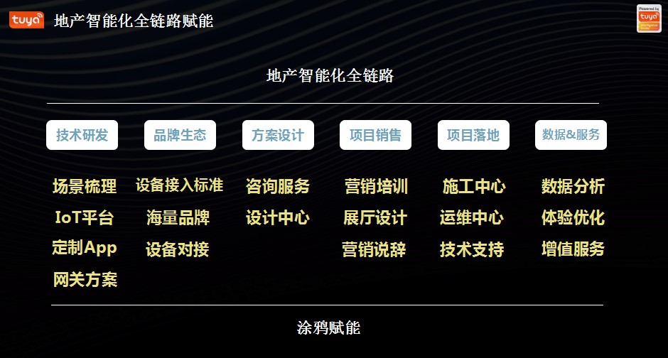 面对这样的市场环境,要实现地产转型与升级,必须要提升房产品竞争力,连接用户并进行数据沉淀,精准服务增值创收。针对地产智能化,涂鸦智能可以提供从连接层到业务层一站式技术服务,从产品研发到项目落地全链路赋能,实现高效率和强落地。