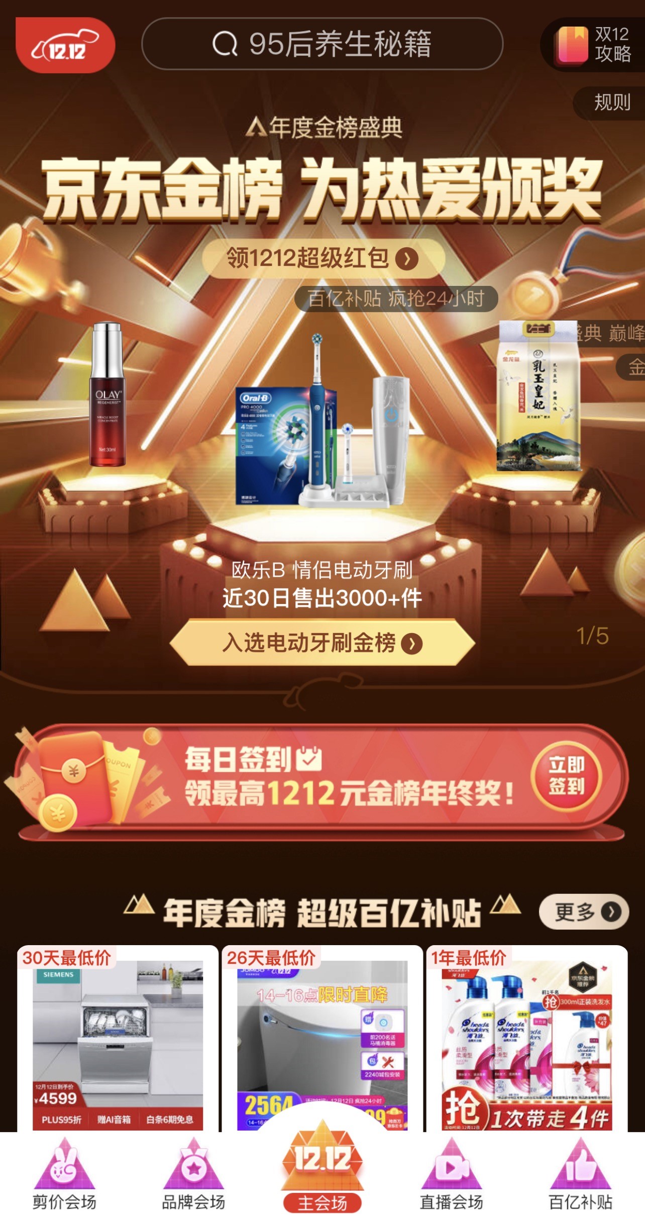 用户打开京东APP就可以通过首页跳转快速前往金榜盛典界面,大量品牌优质好物都被分门别类的排放进不同榜单,每一类商品都有最佳金奖单品及相关专家评语,还有权威发布、爆款Live等众多模块,玩法多样;另外在这一活动界面,用户还可每日签到领取“年终奖”,有机会获得无门槛红包和大额优惠券,福利十足、玩法简单。