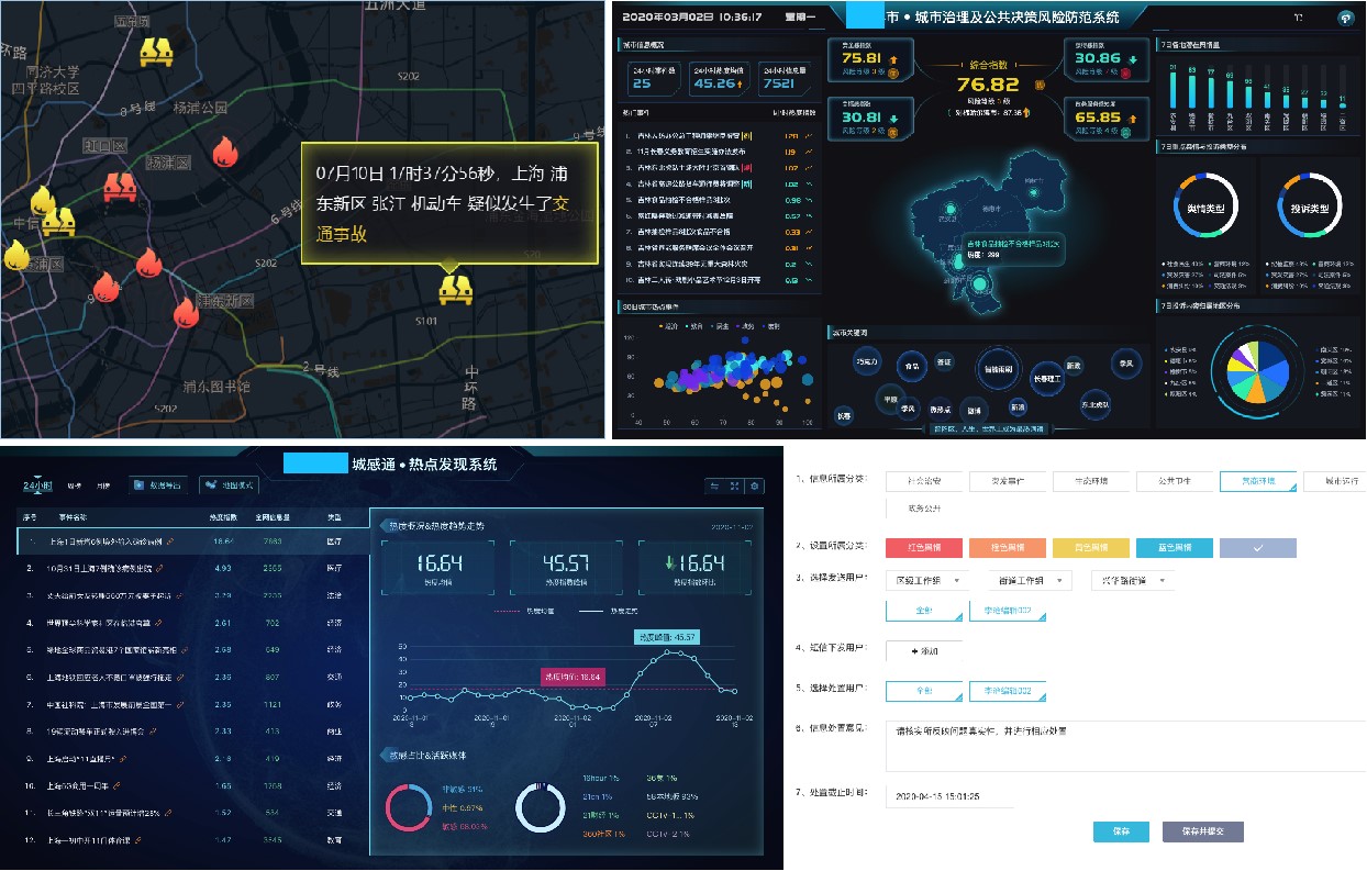 “城感通”以新媒体大数据为基础,运用先进的大数据与人工智能技术发现并收集互联网平台中的海量民情民意信息,通过“突发事件感知”、“风险防范感知”、“城市热点发现”、“转办督办工作台”四大子系统,帮助政府机构与相关部门及时发现、快速感知城市(区域)内的突发事件和舆论态势,并通过线上平台为各级各部门提供具体问题督办解决的全流程服务。