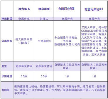 英文词典版本的话,阿尔法蛋、有道词典笔3都是牛津高阶词典(阿尔法蛋是牛津高阶9,有道词典笔3专业版是牛津高阶、韦氏等,旗舰版是汉英大词典),讯飞的是朗文高阶词典,这几款也几乎都配有中文类的词典,比如现代汉语规范词典、古代汉语词典等,大家可以根据需要查阅。