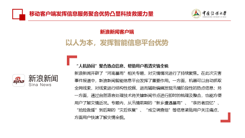 紧急突发事件来临时,信息的及时、准确、透明成为灾情下人们最迫切的需求。报告显示,2021年河南暴雨灾害事件中,新浪新闻智能信息平台发挥了重要作用,其开辟的“河南暴雨”相关专题,对灾情情况进行了持续聚焦。不仅利用机器自动抓取全网线索,进行结构性挖掘,进而辅助编辑发现汛情阶段性的热点信息,更通过自然语言处理技术将关键新闻节点进行即时的梳理及整合,以方便用户了解灾情近况。通过“人机协同”新浪新闻实时聚合热点信息,帮助用户快速看清灾情全貌。