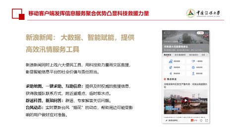 前沿技术的加持,不仅为信息平台智能赋能,灾情也催生了一批以技术为支撑的服务型产品,根据中国传媒大学新媒体研究院的研究,灾情发生后,提供高效、便捷的汛情服务工具的新浪新闻,凸显了其作为智能信息平台的科技救援力量。新浪新闻同时上线六大便民工具,其中,“救助地图”、“一键求助”、“互助信息”等功能提供了及时权威的救援信息、附近避难点等一系列服务。新浪新闻用科技助力暴雨灾区救援,彰显智能信息平台的社会价值与责任担当。