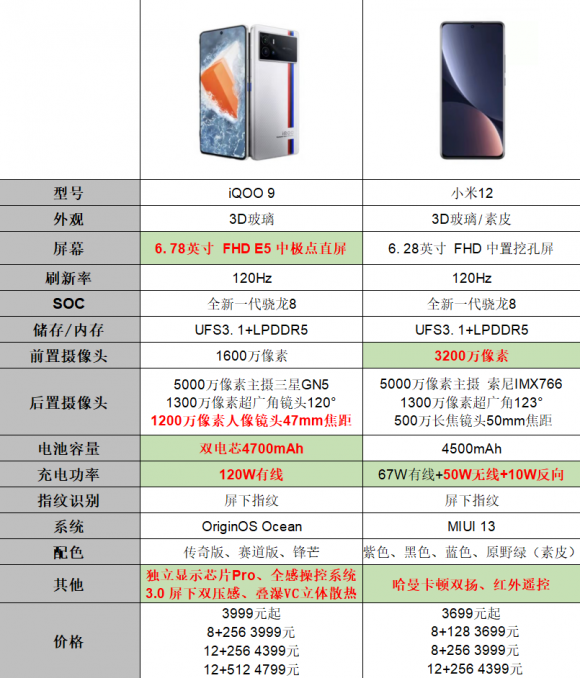 在其他参数方面,两款机型可以说是各有特色。其中续航方面,iQOO 9搭载了4700mAh电池,并配有120W有线充电,在19分钟左右就能充到100%。小米12则配有4500mAh电池,以及67W有线+50W无线+10W反向充电,相比之下,该机虽然在电池容量和充电速度方面落后于iQOO 9,但充电技术更加丰富,应用场景也更广泛。