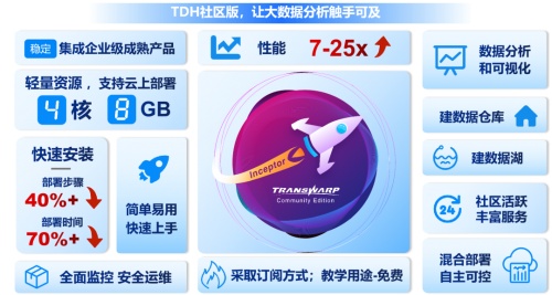 为了降低使用大数据技术的门槛与难度,普及大数据技术,赋能更多企业用户使其更具备竞争力,让更多的高校师生、科研机构,开发者等都能学习和使用大数据技术,星环科技推出了集易安装、易使用,易管理,易运维,更轻量于一体的大数据基础平台——TDH社区版。