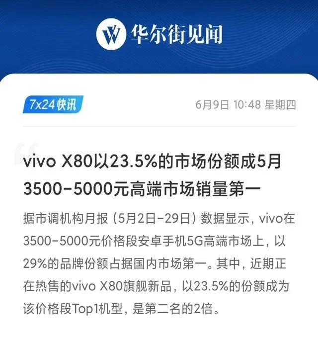 全能的表现,升杯不升价的策略,让vivo X80系列的销量一飞冲天。在5月份3500~5000价位段的手机市场中,vivo取得了29%的品牌份额,成功登顶国内市场。而在该价位段,旗舰机型#vivo X80#系列则凭借23.5%的亮眼份额成绩,成为销量Top1的机型。