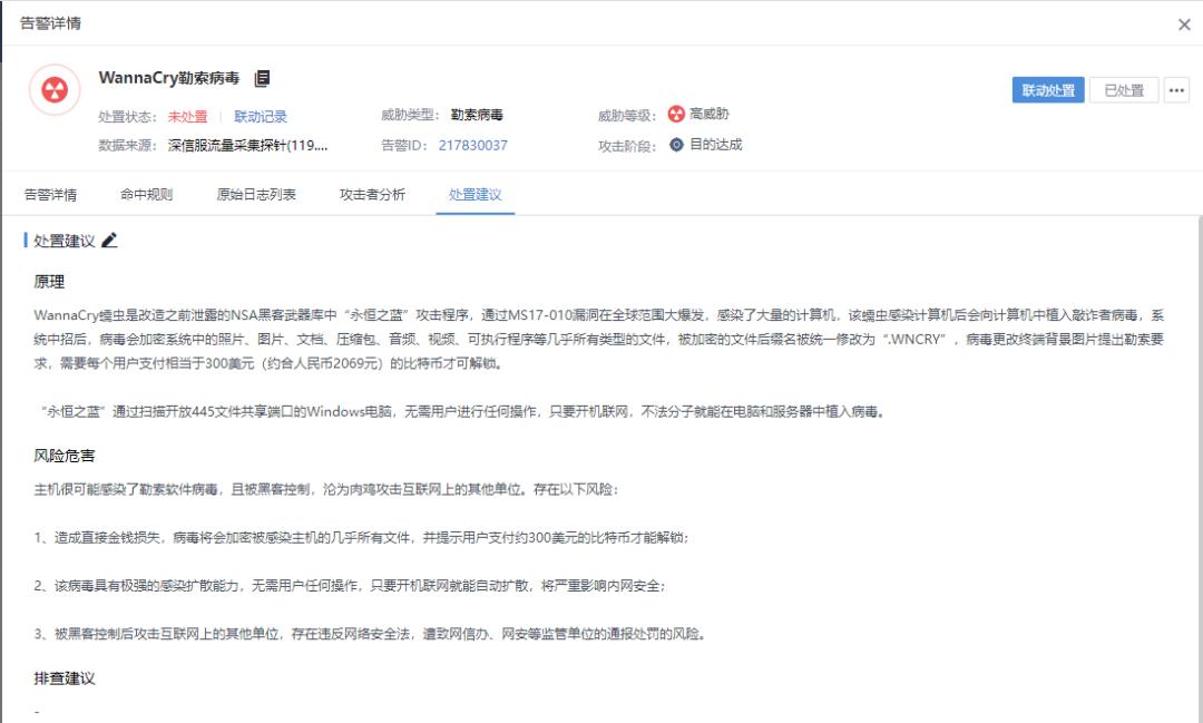 5分钟内,深信服实时在线安全运营团队迅速通报威胁情况并给出防护建议: