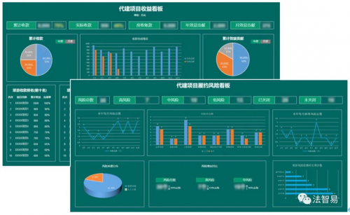 法智易代建合同履约管理产品以自主平台为基础进行研发,全方位服务企业数字化转型,作为数字化管理的重要一环,实现履约过程的实时、准备、精细化管理,系统提供代建业务的代建收益看板以及代建履约风险看板。