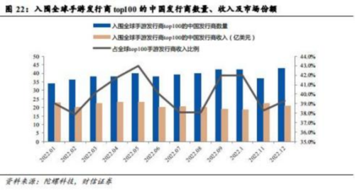 2022 年全球及 国内手游 同 比分别 降低 10.26%和 14.40%, 中 国 自研游戏出海收入同比降低 3.70%,主要系全球疫情消费需求回落及国内版号暂停等影 响 。 出海市场整体竞争日趋激烈 ,但 中 国手游发行商 的全球竞争力持续增强,入围全球手游发行商收入榜单 top100的中国手游发行商数量从 2022 年 1月 的 34 家提升到了 2022 年 12 月的43家。