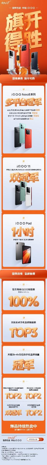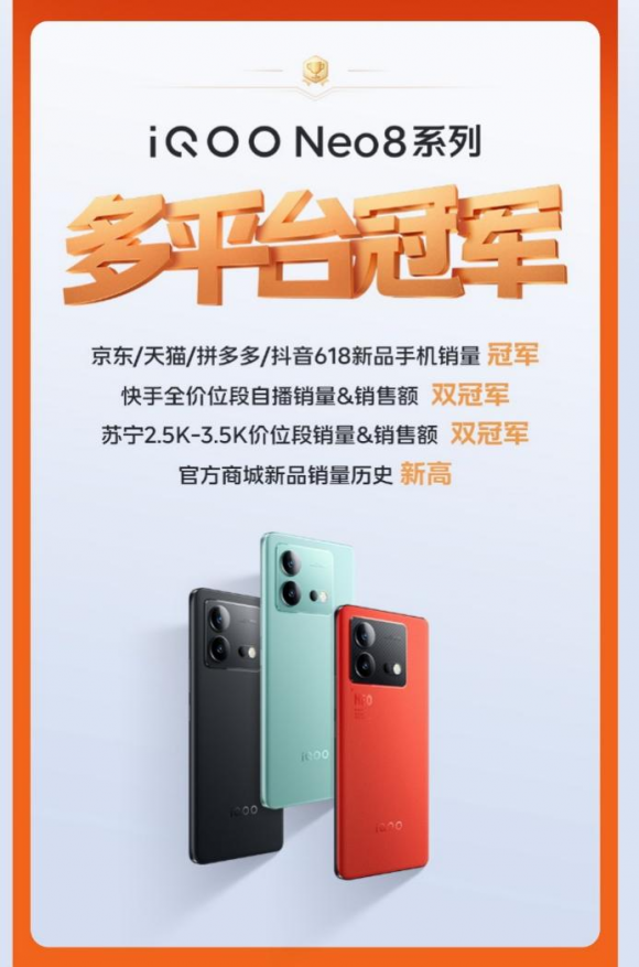 618大促开门红iQOO大招频出,全系产品以强悍性能表现和超有诚意的价格,引领行大促活动,iQOO Neo8系列和iQOO 11更成为各大电商平台的销售冠军。对这些强悍产品有兴趣的朋友,切莫错失良机,抓紧时间赶快购买自己心仪的产品吧。