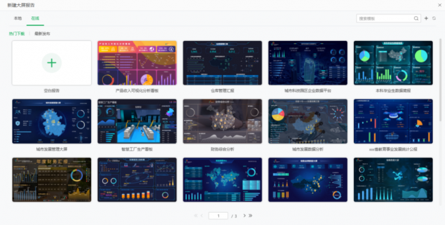 为了帮助用户更快速地开始制作大屏报告,我们提供了5个内置的大屏模板。这些模板包含了各种不同风格和布局的设计样式,您可以直接套用它们,减少从零开始设计的时间成本。