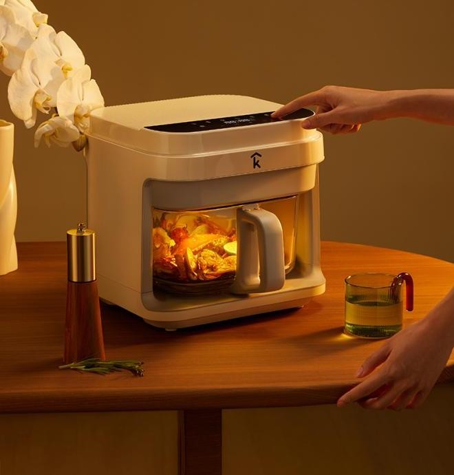 特别值得注意的是,与传统密封的空炸不同,科西FR1空气炸锅工作时,独特的360°透视玻璃设计,可以让用户共同见证美食的诞生,不错过食物的每一丝变化,更满足了“手机先吃、朋友圈见证”等年轻一代的社交需要。