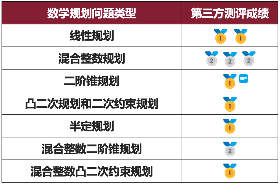 COPT 7.0支持求解的问题类型及最新性能测评结果汇总如下表所示: