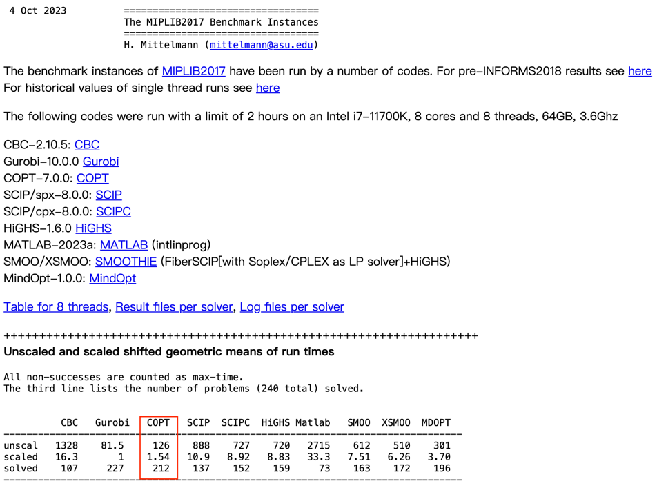 注:上表数据来源于美国亚利桑那州立大学Hans Mittelmann 教授维护的国际权威数学优化软件测评平台 http://plato.asu.edu/bench.html 2023年10月17日的测评结果。