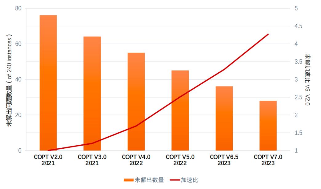 2. “未解出数量”表示在MIPLIB 2017算例集(240个算例)中,COPT每次更新版本未能解出的问题数量;