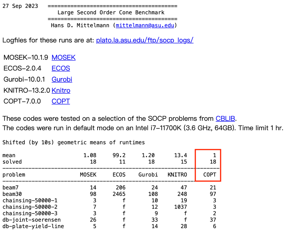 COPT 7.0 二阶锥规划(SOCP)求解模块测评结果