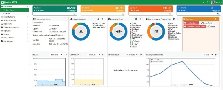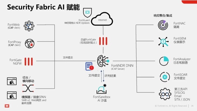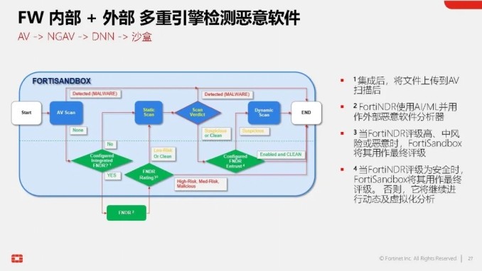 此外,AI技术还贯穿于Fortinet的多个产品与功能中,形成高效的工作流。以威胁检测与响应为例,当FortiGate的双引擎也无法确定某个文件的合法性时,它可以将该文件提交给FortiNDR进行深度分析,利用云端深度神经网络AI进行0 Day攻击、勒索软件等深层次分析。若仍无法确定,还可进一步提交给FortiSandbox,在虚拟机环境中进行模拟操作,进行更为深入的检测。在这一系列流程与技术的支持下,Fortinet的威胁检测与响应能力已达到业界顶尖水平,向满分100分迈进。