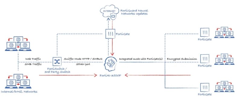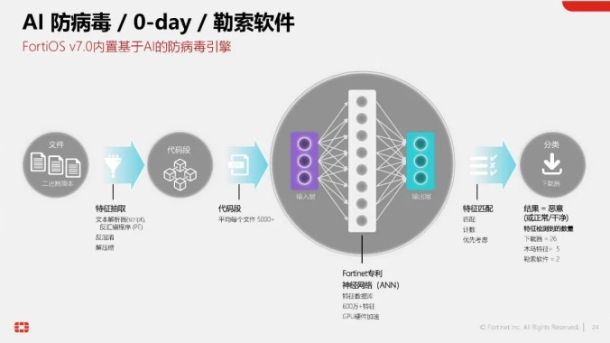 目前,AI技术已深度融入Fortinet的数十种产品与方案中。在最新版的统一网络安全操作系统FortiOS 7.6中,就已经内置了由FortiGuard AI实验室研发的基于AI的防病毒引擎。该引擎运用神经网络技术,学习并区分海量病毒文件与正常文件,通过分类打分的方式,实现对未知文件与病毒的精准判断,无需依赖传统的病毒特征库。因此,Fortinet的FortiGate等产品在防病毒方面拥有双引擎加持,既有传统的基于病毒特征库的防病毒引擎,又有基于AI的下一代防病毒引擎(Anti-virus NGAV),双重保障,安全无忧。
