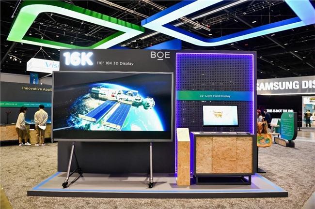 本次SID,BOE(京东方)携三大技术品牌重磅首发的多款行业领先显示技术和产品惊艳亮相。步入展区,首先映入眼帘的是BOE(京东方)重磅首发的全球首款16K 110英寸超大尺寸裸眼3D显示屏,并以超高清、超高分辨率、多视点、广色域等优势突破了显示行业的创新高度,该产品搭载高色域Mini LED背光技术以及BOE(京东方)自主研发的16K交织排图算法,3D视角扩大至60°,广泛应用于广告、会议、教育等多元化场景。