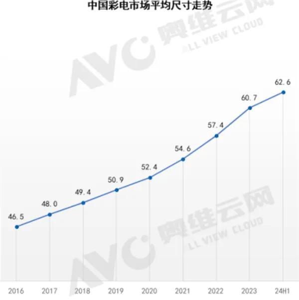 根据奥维云网统计数据,中国彩电市场的平均尺寸,一直在逐年上升,在今年一季度,已经达到62.6吋。