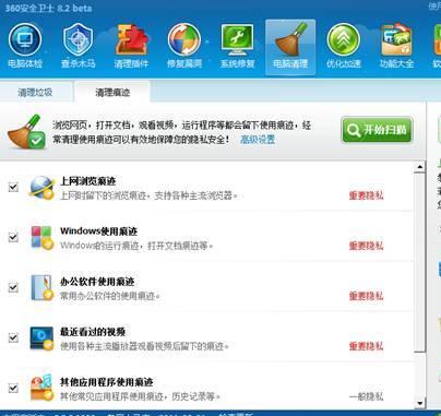 在百度知道搜索“删除 电影 记录”,发现有超过20万个以上的提问,可见用户对播放记录的删除方法十分关心。删除操作记录可以手工实现,但比较麻烦,最好借助一些工具软件来实现,如360安全卫士中的“电脑清理”功能,很容易将各种记录清除干净(见图2)。此外,上网用户可以使用360浏览器的“无痕浏览”功能,也可以保证不会留下浏览痕迹。