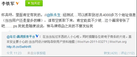 金山网络反病毒工程师李铁军(微博)转发了此条微博,称“有漏洞及时处理,天不会塌下来,不重视安全漏洞,不及时修补才是致命的”。