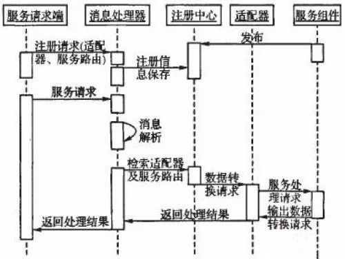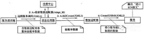 基于SOA的ESB集成框架定义了一个数据适配器完成数据转换、消息驱动服务的模型。将业务处理逻辑封装成一系列的服务组件,消息处理器接收系统外发送来的请求消息,通过注册中心检索相应的数据适配器完成数据转换,将转换后的数据封装成一定格式的数据消息,调用服务组件,完成数据处理。