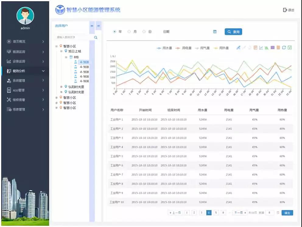 能效分析模块主要包括实时报表查询和历史报表查询。主要实现小区住宅用户的能源使用情况按照年、月、日进行数据的查询和排名,以及能耗监测情况和优化用户参与度情况查询分析。