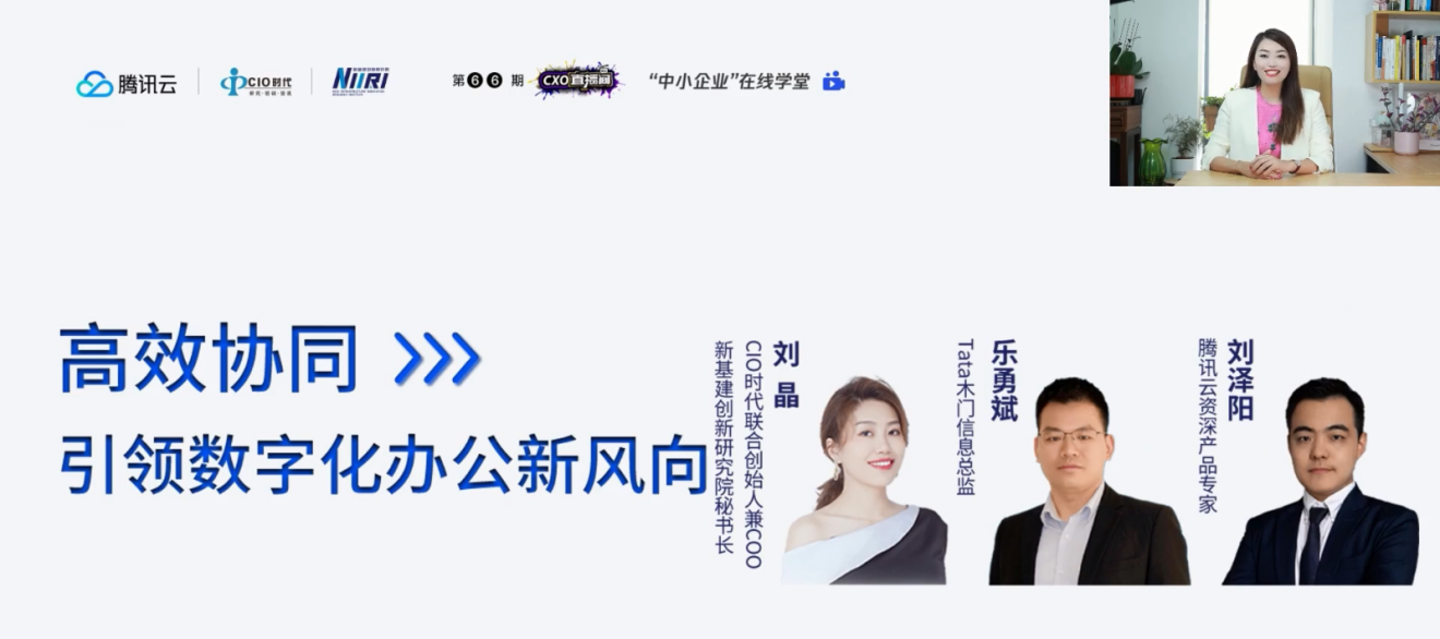 8月31日,由CIO时代、新基建创新研究院联合腾讯云共同打造的“第66期CXO直播间”成功举行,在CIO时代联合创始人兼COO、新基建创新研究院秘书长刘晶的主持下,与TATA木门(北京闼闼同创工贸有限公司)信息总监、第28届CIO班学员乐勇斌、腾讯云资深产品专家刘泽阳,共同围绕“高效协同 引领数字化办公新风向”主题,探讨了企业数字化办公的现状和未来发展趋势。