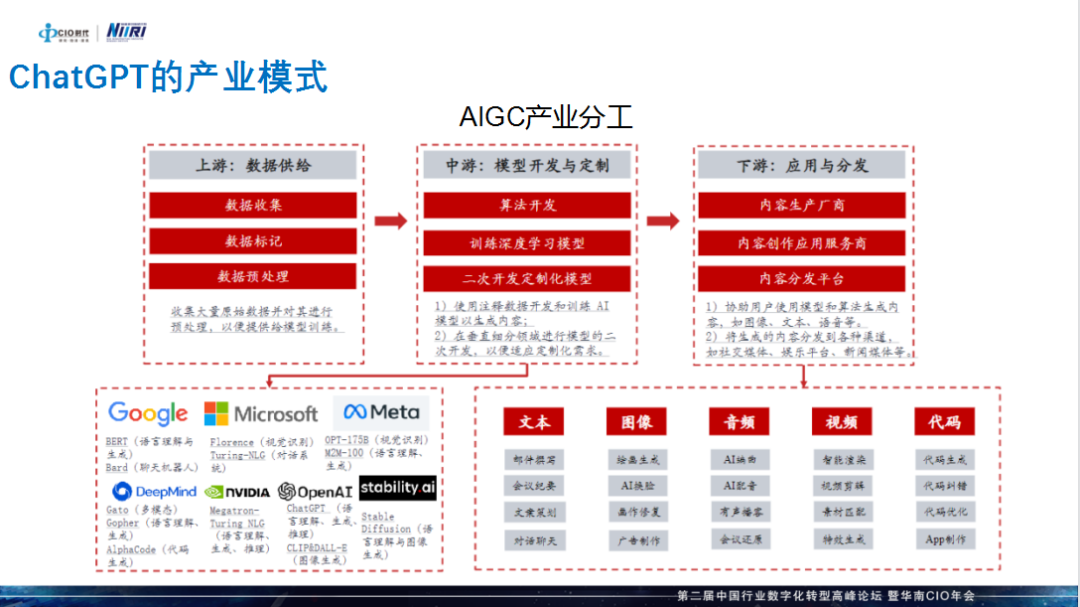 在产业模式方面,以ChatGPT为主的产业正处于爆发阶段,包括代码生成、问答等。其产业分工主要分为三部分:一是数据供给、数据采集、数据标注;二是模型定制开发,我们需要能够理解ChatGPT模型的技术人员,并且使用迁移学习技术,在垂直细分领域进行模型的二次开发,以便适应定制化需求;三是应用集成开发。