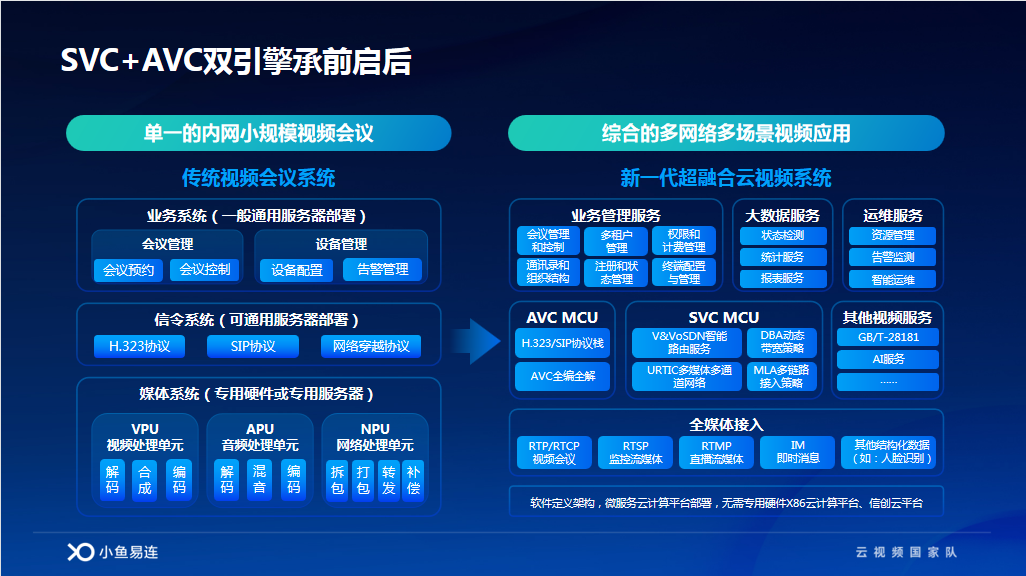另外,小鱼易连能提供“SVC+AVC”双引擎的融合平台,AVC MCU利旧原有系统,存量的硬件视频系统和终端都可以接入;SVC 满足新场景需求,承前启后、平滑过渡。