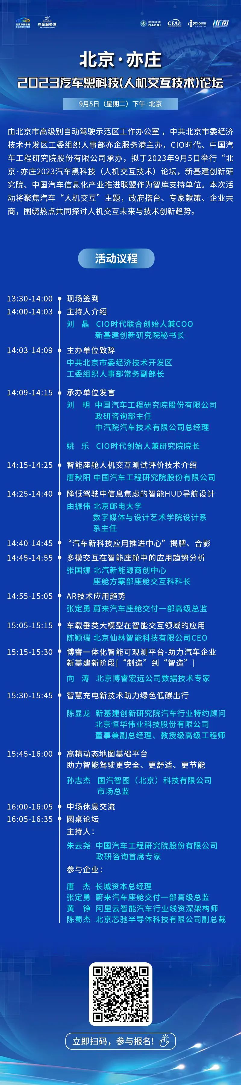 9月5日,由北京市委经济技术开发区工委组织人事部亦企服务港、北京市高级别自动驾驶示范区工作办公室主办,中汽院汽车技术有限公司、CIO时代承办的“党建链串起产业链”亦企开放日暨北京·亦庄2023汽车黑科技(人机交互技术)研讨交流活动即将举办。活动将聚焦“人机交互技术”主题,探讨智能座舱发展对人机交互的要求以及新设计趋势。