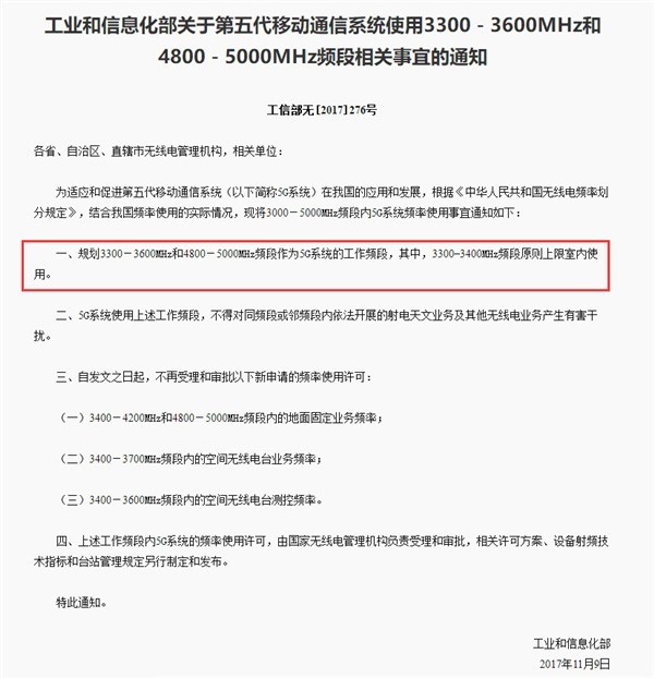 中国工业和信息化部近日发布通知,正式宣布规划3300-3600MHz、4800-5000MHz频段作为5G系统的工作频段,其中3300-3400MHz频段原则上限室内使用。