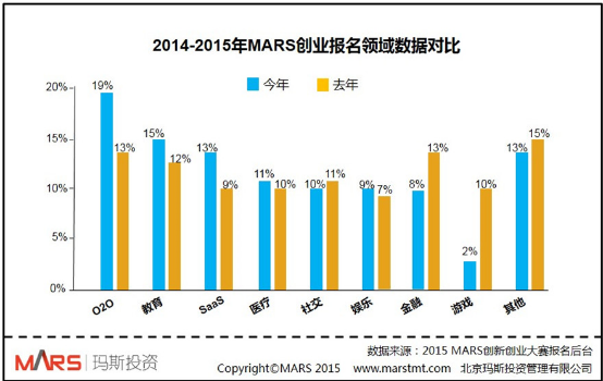 从MARS互联网创新创业大赛最新的数据来看,2015年最受创业者关注的创业领域,排名前四位的,分别是O2O、教育、SaaS和医疗。而往年的创业热门领域(电商、游戏、社交等)似乎正在逐渐失宠。